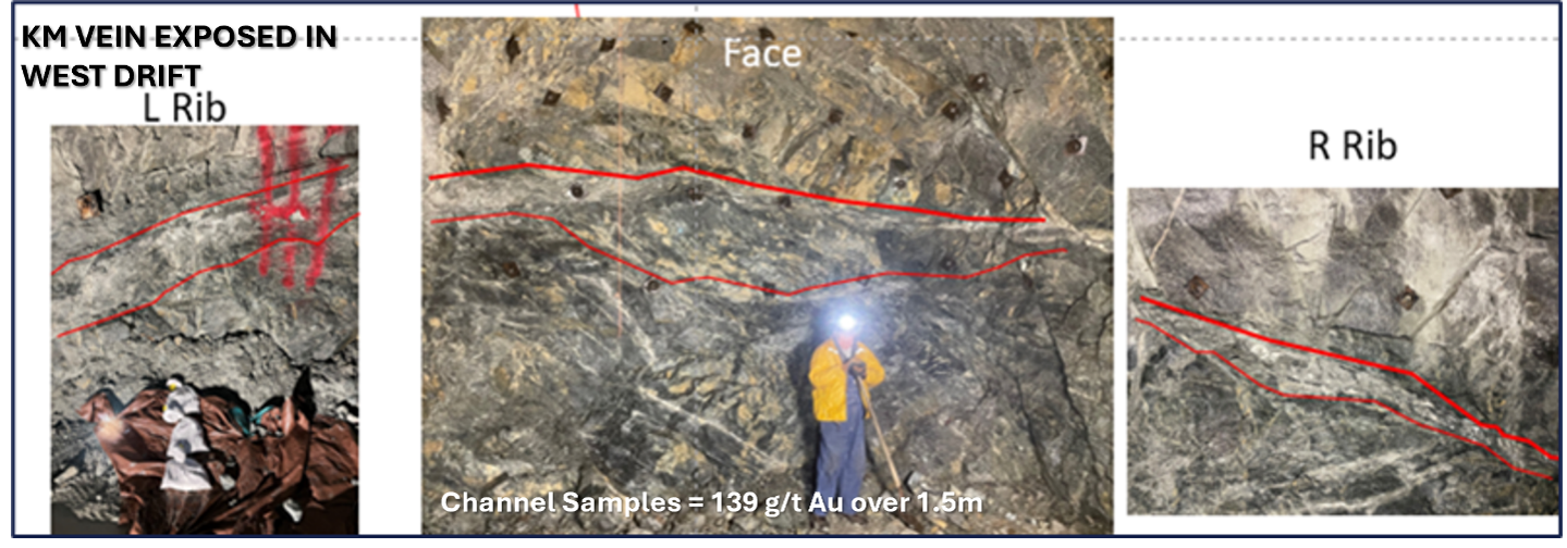 Detailed geological logging and structural interpretation indicate that the KM vein is a discrete mineralized structure, distinct from the L2, L1b, and L1c veins. The orientation and grade characteristics of the KM vein are consistent with gold mineralization previously reported from underground exposures in the West Drift, including a reported channel sample interval averaging approximately 139 g/t Au over 1.5 meters (Figure 2; Contango press release dated November 19, 2025).