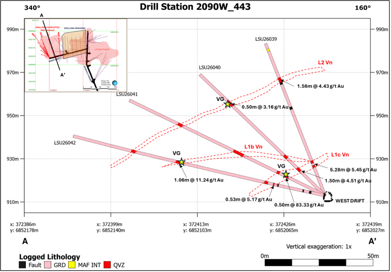 - LSU25041: 0.50 m averaging 82.33 g/t Au (L1c vein)