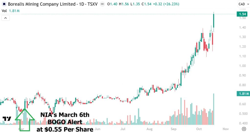 Borealis Mining (TSXV: BOGO) gained by 26.23% yesterday to a new all-time high of $1.54 per share on record volume of 1.81 million shares. On March 6th with BOGO at $0.55 per share, NIA sent out an alert saying, "Eric Sprott bought 3,571,400 shares of Borealis Mining (TSXV: BOGO) on February 26th at $0.56 per share increasing his stake to 7,571,400 shares. Rob McEwen bought 1,785,700 shares of Borealis Mining (TSXV: BOGO) on February 26th at $0.56 per share increasing his stake to 15,233,853 shares."