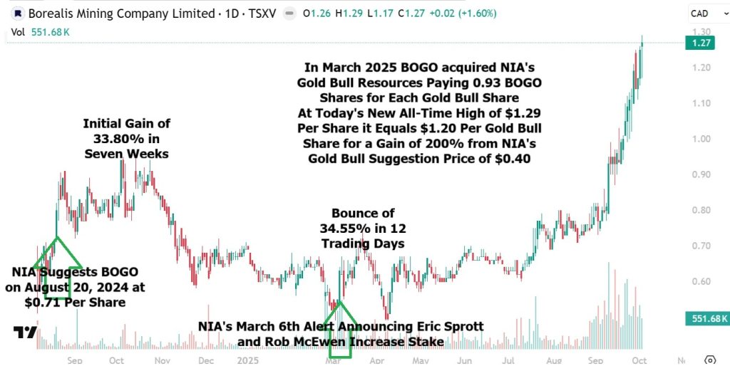 On August 20th, 2024, NIA suggested Borealis Mining (TSXV: BOGO) at $0.71 per share. Click here to read NIA’s initial BOGO alert. Over the following seven weeks, BOGO gained by 33.80% to a new all-time high of $0.95 per share. During this seven-week time period, BOGO gained 40x more than GDX and GDXJ.