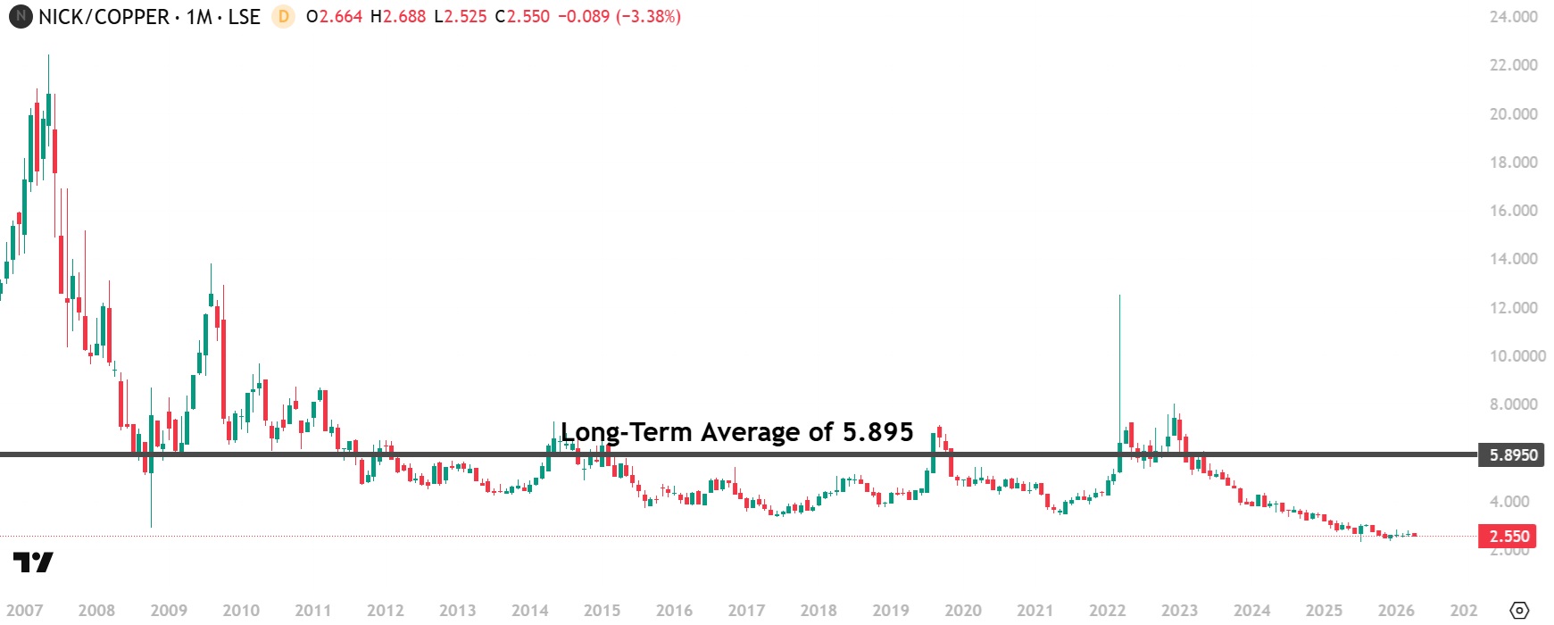 The nickel/copper ratio hit an all-time low on July 7, 2025, of 2.299 and is currently 2.551 only slightly above the all-time low. It is trading 56.73% below its long-term average of 5.895.