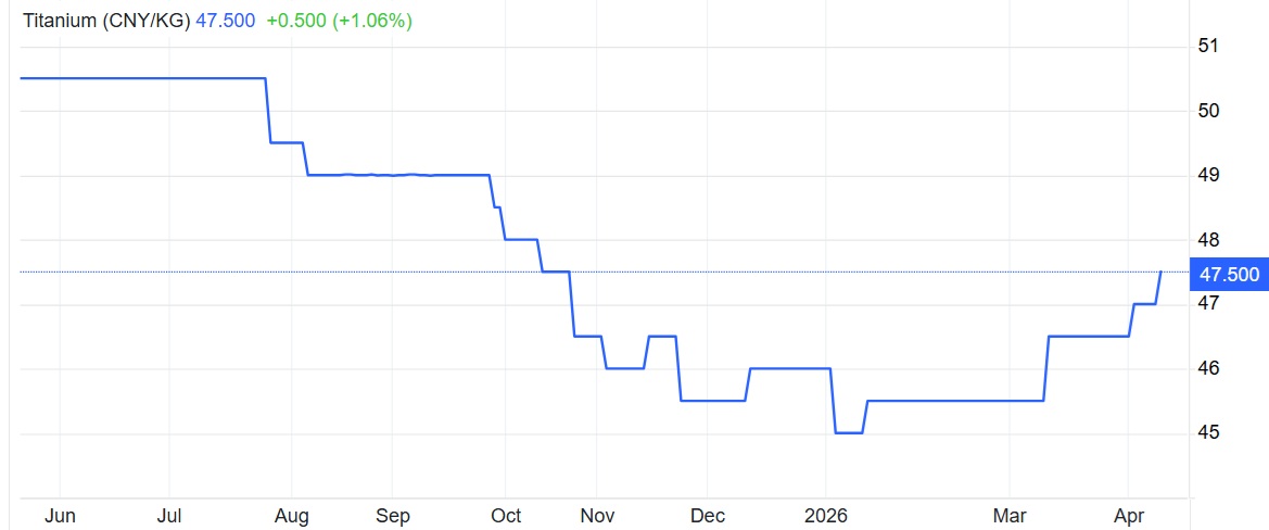Titanium gained another 1.06% today to a new six-month high of 47.50 CNY/KG.