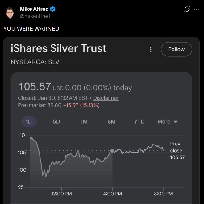 Crypto promoter Mike Alfred tweeted yesterday, “YOU WERE WARNED”, while posting a chart of the iShares Silver Trust (SLV) pulling back from its all-time high.