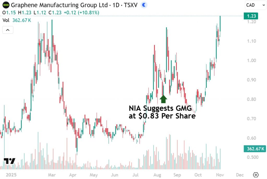 On August 12th, NIA alerted its members to Graphene Manufacturing Group (TSXV: GMG) at $0.83 per share as a graphene play that actually has real products unlike Turbodyne Technologies (TRBD) or its modern-day equivalent Hydrograph Clean Power (CSE: HG).