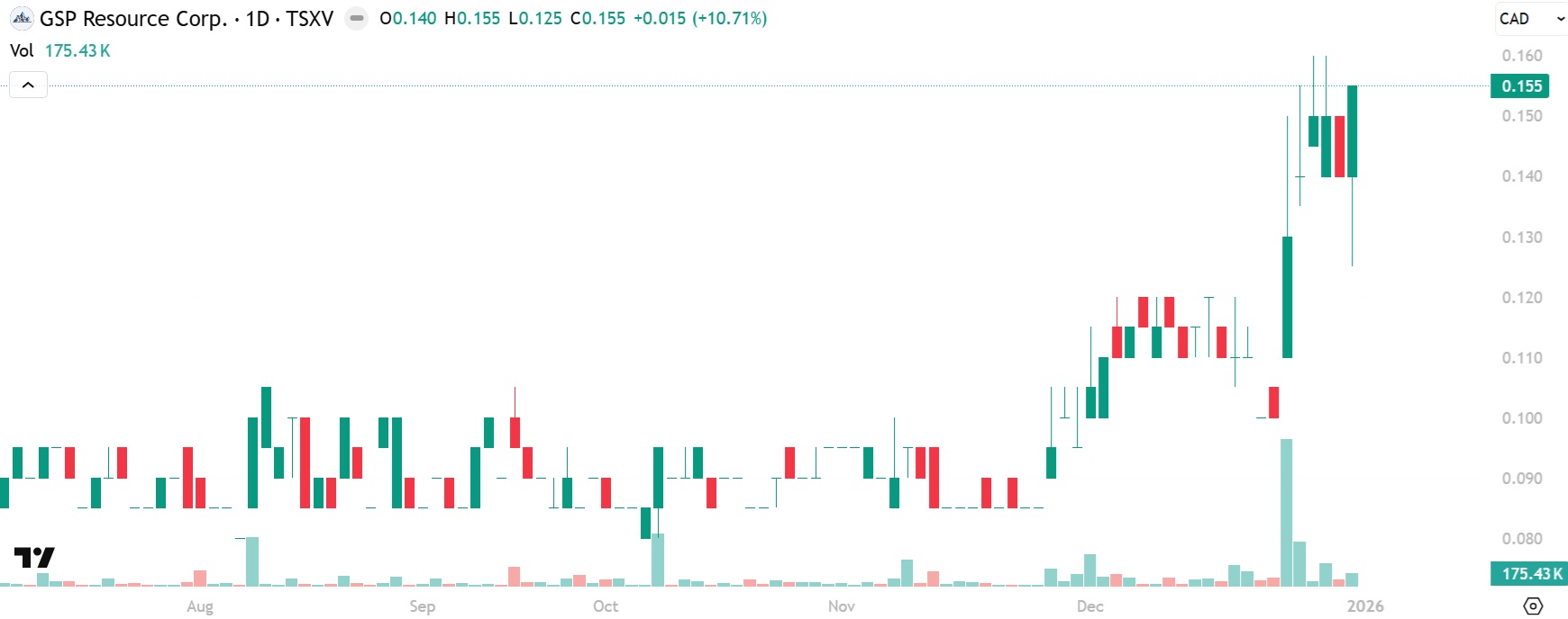 NIA's latest brand-new stock suggestion GSP Resource (TSXV: GSPR) gained by 10.71% today to a new 52-week closing high of $0.155 per share!