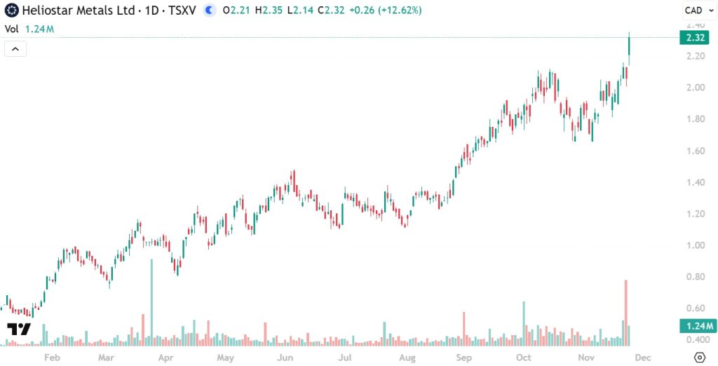 NIA's #2 favorite producing gold miner Heliostar Metals (TSXV: HSTR) gained 12.62% today to a new all-time high of $2.32 per share and has so far gained by 87.85% since NIA's July 15th suggestion at $1.235 per share!