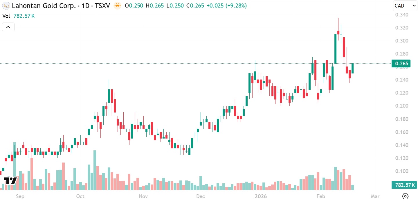 Lahontan Gold (TSXV: LG) gained 9.28% yesterday to $0.265 per share after reporting more maiden drill holes from their newly acquired West Santa Fe, which are rich in silver. WSF25-02R intercepted oxide mineralization of 48.8m grading 0.39 g/t gold and 38.4 g/t silver for 0.83 g/t AuEq. WSF25-05R intercepted oxide mineralization of 45.7m grading 0.36 g/t gold and 24.7 g/t silver for 0.64 g/t AuEq.