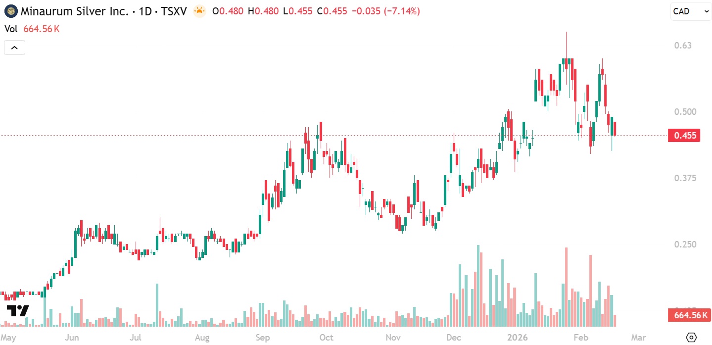 Minaurum Silver (TSXV: MGG) dipped 7.14% yesterday to $0.455. We like MGG because it is fully permitted for silver production and could begin mining if desired. Even companies like Vizsla Silver (VZLA) and Discovery Silver (TSX: DSV) don't yet have production permits in Mexico.