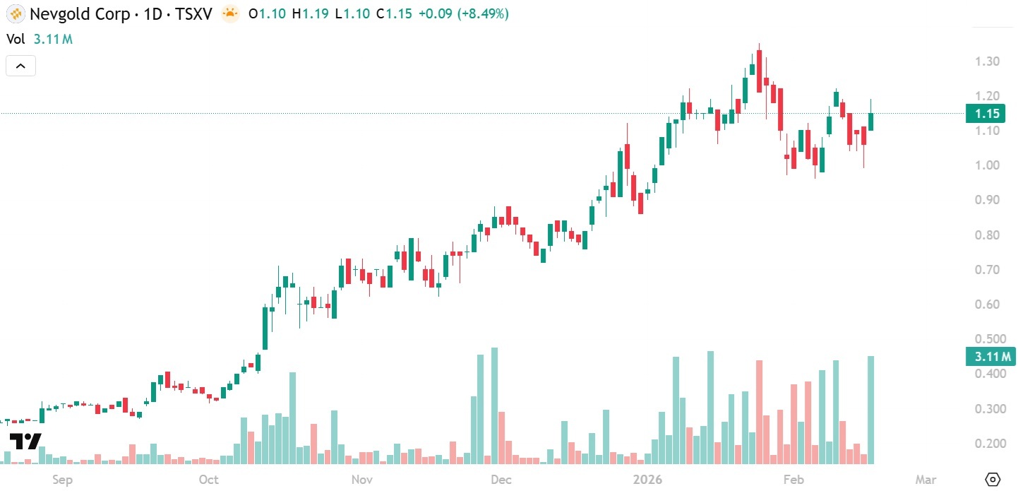 NevGold (TSXV: NAU) gained 8.49% yesterday to $1.15 per share on huge volume of 3.11 million shares. Their maiden resource estimate is coming soon, and the company has been consistently surpassing NIA's highest possible expectations with high-grade gold-antimony intercepts.