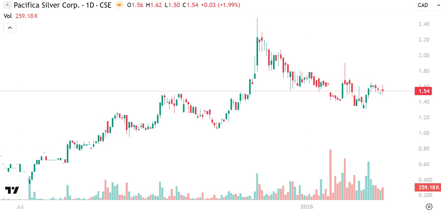 NIA's latest brand-new stock suggestion Pacifica Silver (CSE: PSIL) gained 1.99% yesterday to $1.54 per share but remains 37.90% below its December 1st all-time high of $2.48.