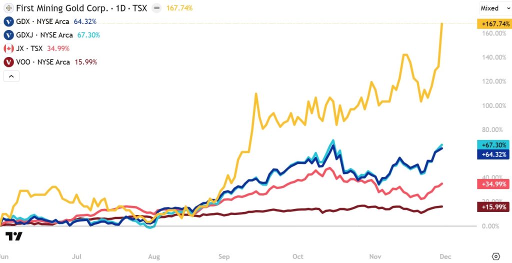 On Friday, First Mining surged 15.28% to a new 4+ year high of $0.415, representing a 167.74% gain in under six months. During this same period, First Mining outperformed: