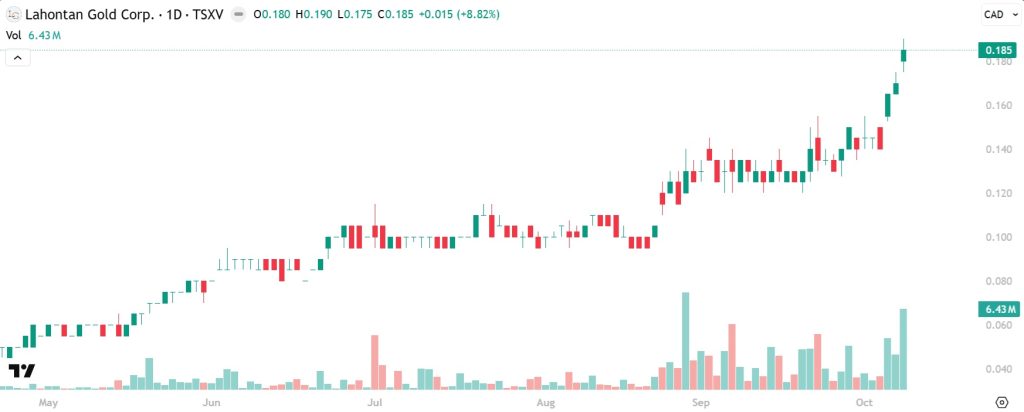 Lahontan Gold (TSXV: LG) gained by 8.82% today to a new 28-month high of $0.185 per share!