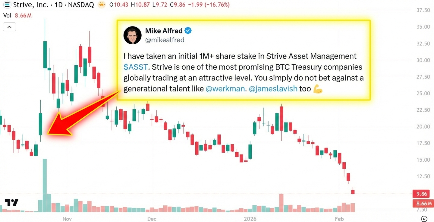 NIA pointed out this past weekend how social media influencer Mike Alfred was trying to distract from his collapsing Bitcoin treasury company Strive (ASST) by "warning people" about silver. ASST has declined another 40% this week alone and just did a 1 for 20 reverse split this morning.