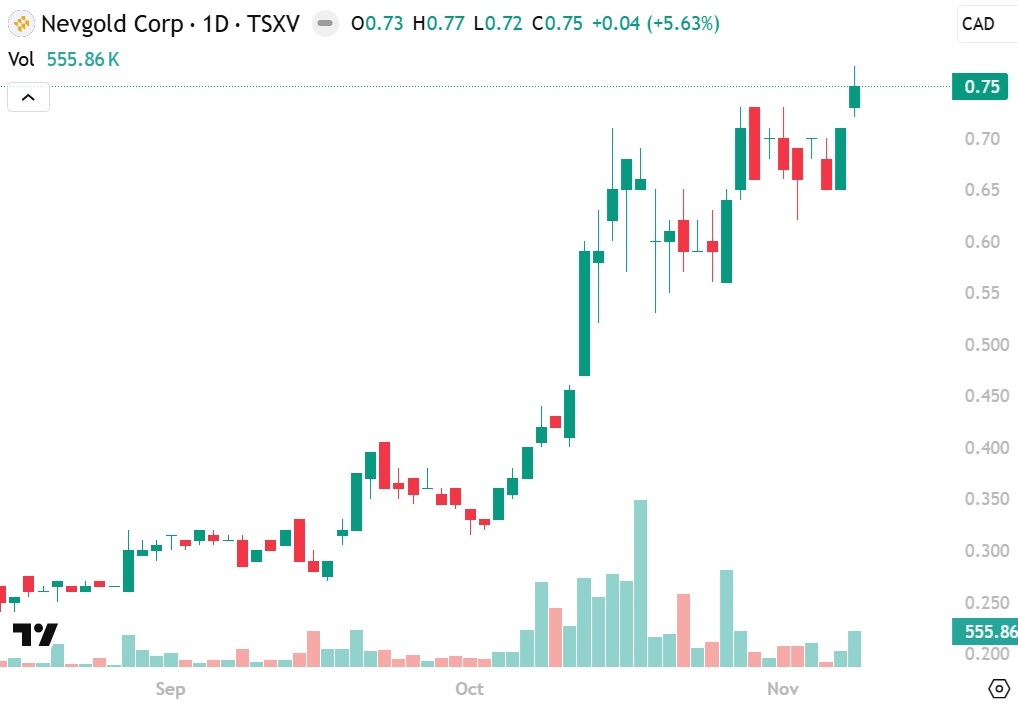 NIA's second to latest brand-new stock suggestion NevGold (TSXV: NAU) gained by 5.63% today to a new 52-week high of $0.75 per share: