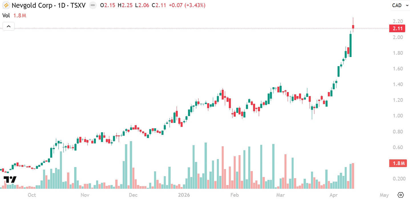 So far in 2026, NIA has sent a total of 45 alerts on NevGold (TSXV: NAU), more than any other company. NevGold gained by 3.43% today to a new all-time high of $2.11 per share!