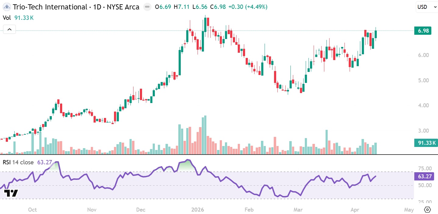 NIA’s #2 favorite overall stock suggestion for 2026: Trio-Tech International (TRT) gained by 4.49% today to a new three-month closing high of $6.98 per share!