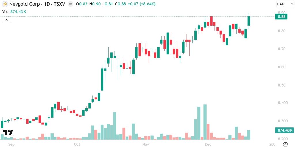NevGold gained by 8.64% today to a new 52-week high of $0.88 per share!