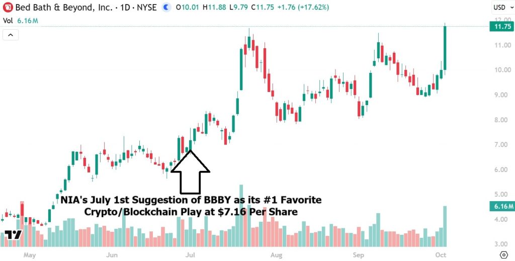 NIA’s #1 Crypto/Blockchain Pick BBBY Gains 17.62% to New 52-Week High of $11.75 Per Share