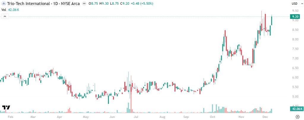 Two months ago, NIA announced Trio-Tech International (TRT) at $6 per share as its #2 favorite overall stock suggestion for 2026. TRT gained by 5.50% today to a new 2025 closing high of $9.20 per share for a two-month gain of 53.33%.