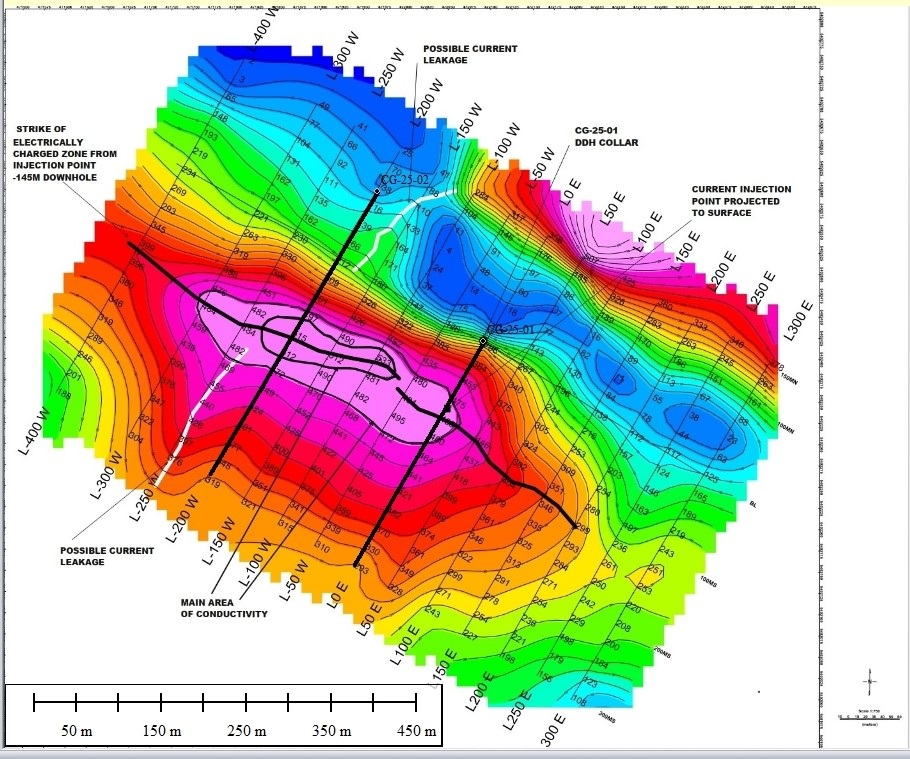 Next steps are already in motion: CG-25-02 is collared roughly 200 meters to the northwest to intersect the same zone at approximately 200 meters vertical depth, and an additional 1,000 meters (2 holes) have been scheduled for Southwest Carnegie Township.