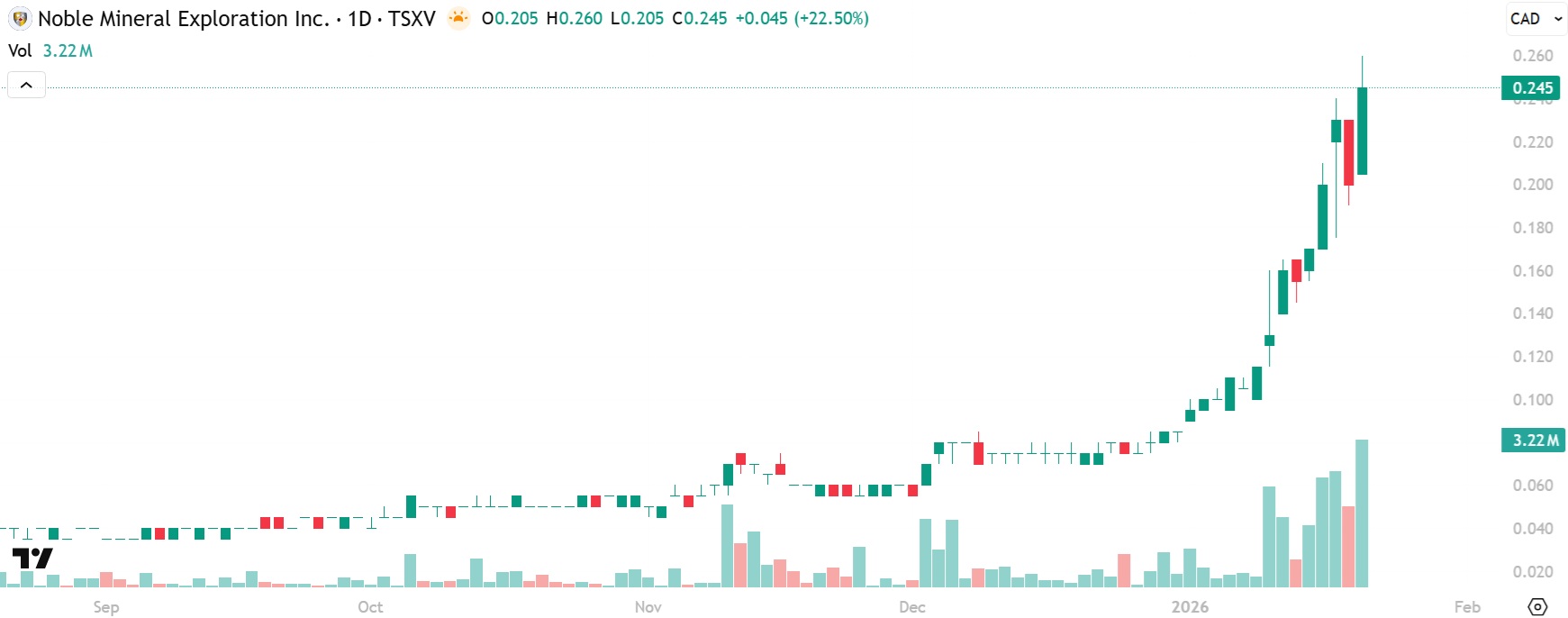 NIA's third to latest brand-new stock suggestion Noble Mineral Exploration (TSXV: NOB) gained by 22.50% on Wednesday to a new 12-year high of $0.245 per share!