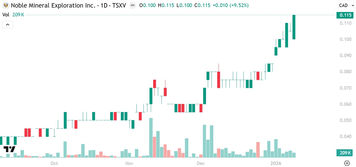 NIA's second to latest brand-new stock suggestion Noble Mineral Exploration (TSXV: NOB) gained by 9.52% today to a new 52-week high of $0.115 per share!