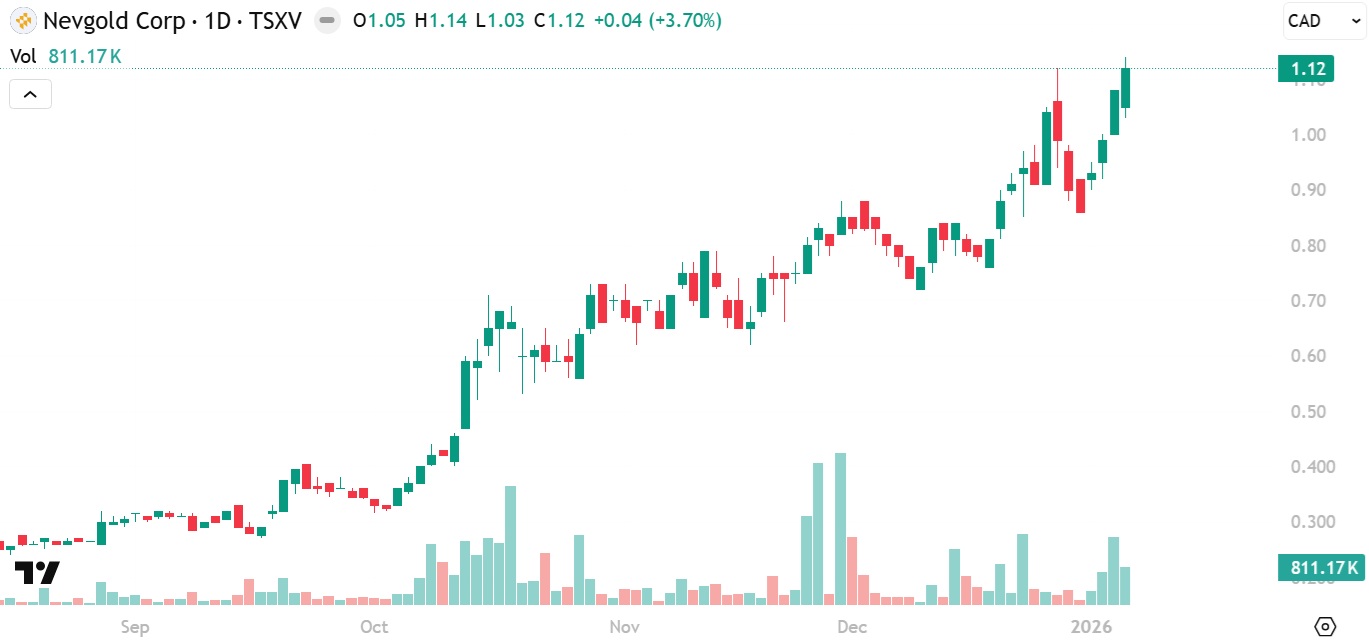 NIA’s fourth to latest brand-new stock suggestion and #1 favorite antimony stock suggestion for 2026 NevGold (TSXV: NAU) gained by 3.70% today to a new 52-week high of $1.12 per share:
