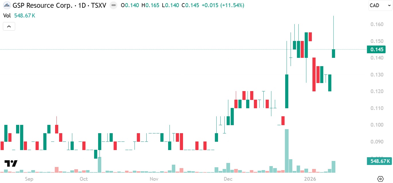 NIA's latest brand-new stock suggestion GSP Resource (TSXV: GSPR) gained by 11.54% today to $0.145 per share and hit a new 52-week high earlier in the day of $0.165 per share! GSPR is the only natural resource company in the CAD$3–$10 million market cap range with a recently established NI 43-101 resource and successful high-grade step-out drilling beyond the current resource footprint—something no other company in its peer group has demonstrated!