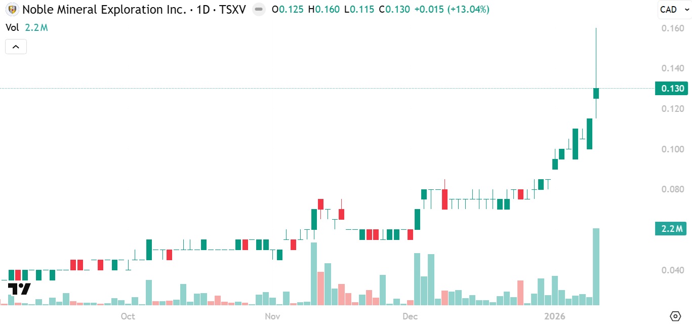 NIA's second to latest brand-new stock suggestion Noble Mineral Exploration (TSXV: NOB) gained by 13.04% today to $0.13 per share and hit a new 52-week high earlier in the day of $0.16 per share! The move underscores why NOB stands apart from every other junior in the nickel space: no other company combines large strategic stakes in both Canada’s and the U.S.’s most important nickel stories plus its 20% ownership of East Timmins Nickel, where two existing nickel sulphide resources already rival Crawford in scale despite only ~40% of the geophysical footprint being drilled—an asymmetry that points directly to tier-one discovery potential!