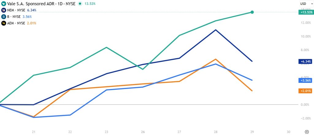 VALE has gained by 13.53%, or 2.13x more than NEM, 3.80x more than B, and 6.73x more than AEM.