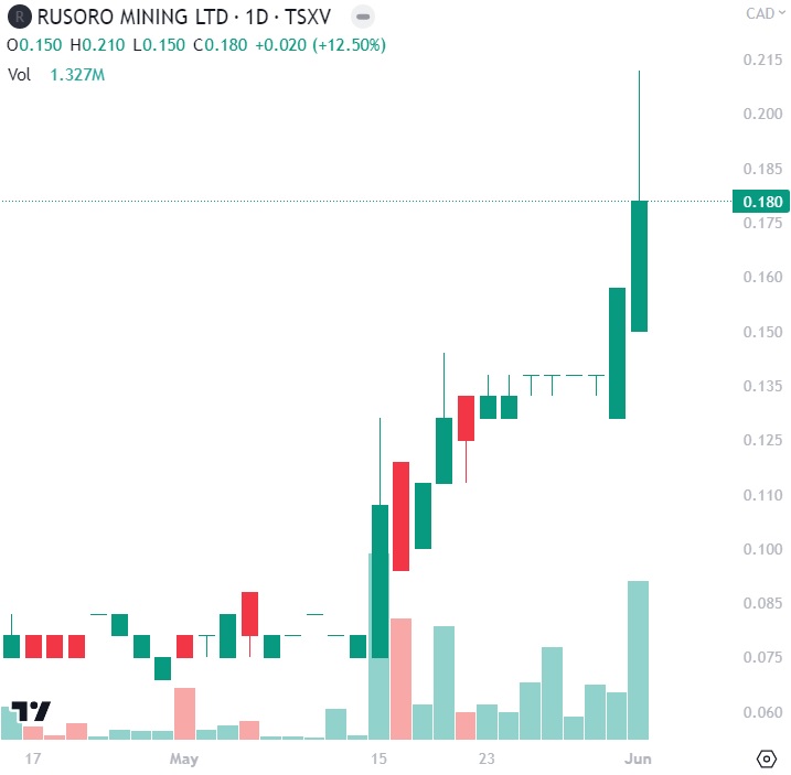 Rusoro Mining (TSXV: RML) gained by 12.5% today to a new 52-week high of $0.18 per share!